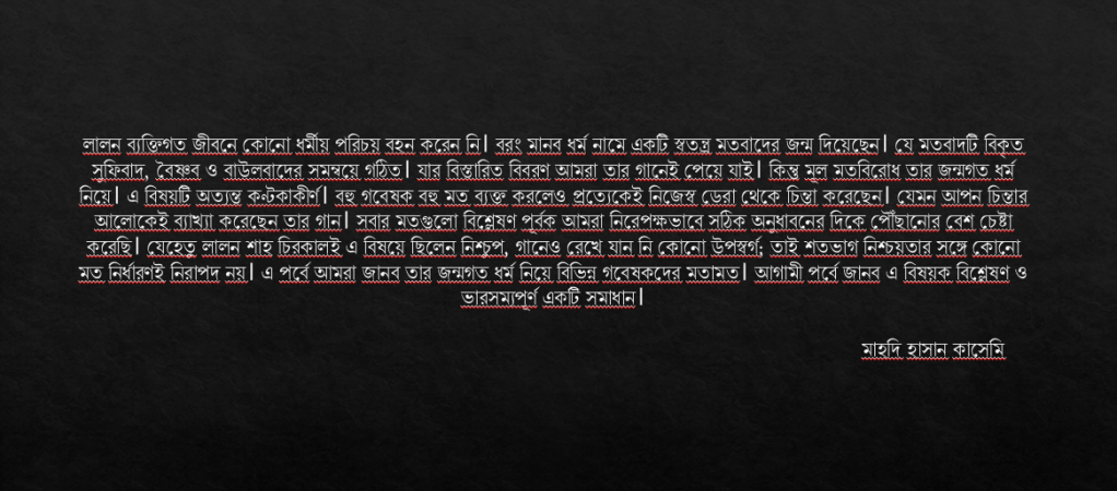 লালন ব্যক্তিগত জীবনে কোনো ধর্মীয় পরিচয় বহন করেন নি। বরং মানব ধর্ম নামে একটি স্বতন্ত্র মতবাদের জন্ম দিয়েছেন। যে মতবাদটি বিকৃত সুফিবাদ, বৈষ্ণব ও বাউলবাদের সমন্বয়ে গঠিত। যার বিস্তারিত বিবরণ আমরা তার গানেই পেয়ে যাই। কিন্তু মূল মতবিরোধ তার জন্মগত ধর্ম নিয়ে। এ বিষয়টি অত্যন্ত কণ্টকাকীর্ণ। বহু গবেষক বহু মত ব্যক্ত করলেও প্রত্যেকেই নিজেস্ব ডেরা থেকে চিন্তা করেছেন। যেমন আপন চিন্তার আলোকেই ব্যাখ্যা করেছেন তার গান। সবার মতগুলো বিশ্লেষণ পূর্বক আমরা নিরেপক্ষভাবে সঠিক অনুধাবনের দিকে পৌঁছানোর বেশ চেষ্টা করেছি। যেহেতু লালন শাহ চিরকালই এ বিষয়ে ছিলেন নিশ্চুপ, গানেও রেখে যান নি কোনো উপস্বর্গ; তাই শতভাগ নিশ্চয়তার সঙ্গে কোনো মত নির্ধারণই নিরাপদ নয়। এ পর্বে আমরা জানব তার জন্মগত ধর্ম নিয়ে বিভিন্ন গবেষকদের মতামত। আগামী পর্বে জানব এ বিষয়ক বিশ্লেষণ ও ভারসম্যপূর্ণ একটি সমাধান।
